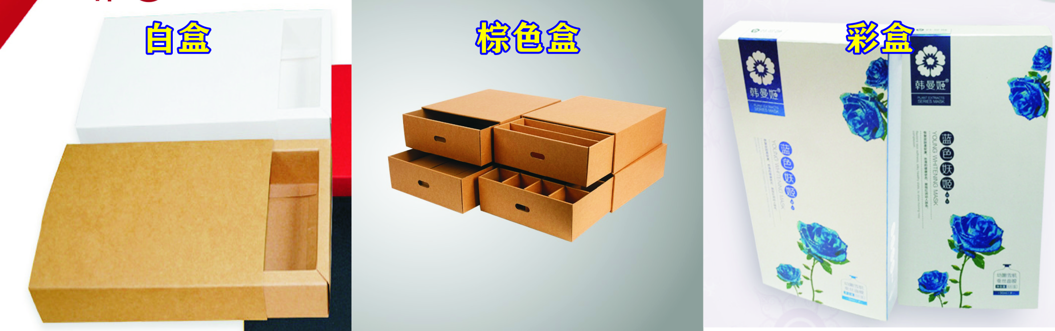 3) 紙盒類——白盒,棕色盒,彩盒。